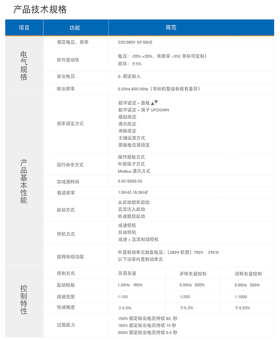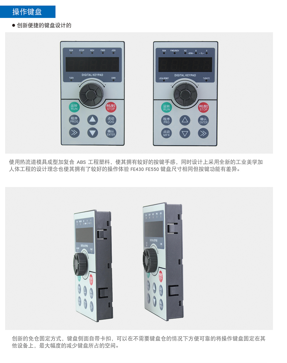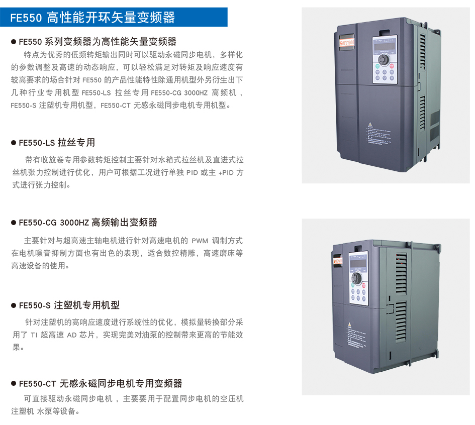特点为优秀的低频转矩输出同时可以驱动永磁同步电机,多样化的参数调整及高速的动态响应,可以轻松满足对转矩及响应速度有较高要求的场合针对FE550的产品性能特性除通用机型外另衍生出下几种行业专用机型 FE550-LS拉丝专用 FE550-CG 3000HZ高频机 ,FE550-S 注塑机专用机型,FE550-CT 无感永磁同步电机专用机型。