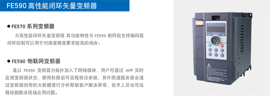 是以FE550变频器为拓扑加入了网络模块,用户可通过APP 实时监测变频器状态,获得权限后可远程修改参数,另外西通服务器会通过变频器回传的大数据进行分析帮助客户解决异常,技术人员也可远程协助解决现场应用问题。